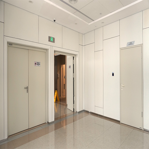 考慮到醫(yī)院整體設(shè)計風(fēng)格及場所的特殊性,木質(zhì)型防火門可進行表面油漆粉刷或粘貼飾面板,根據(jù)使用部位的需要,可選擇具有一定的透光和透視性的帶有防火觀窗及亮窗的防火門。