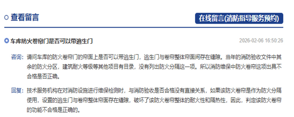 回復(fù):技術(shù)服務(wù)機(jī)構(gòu)在對(duì)消防設(shè)施進(jìn)行維保檢測(cè)時(shí),與消防驗(yàn)收是否合格沒有直接關(guān)系,如果該防火卷簾是作為防火分隔使用,設(shè)置的逃生門與卷簾整體簾面存在縫隙,破壞了該防火卷簾整體的耐火性和隔熱性,因此,判定該防火卷簾的功能不合格是正確的。